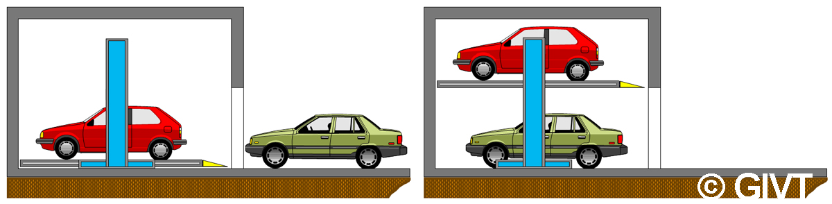 | Doppel-Parker mit horizontal befahrbaren Plattformen (Lift-Parker) für das Parken von 2 Pkw übereinander mit unabhängigem Zugriff auf beide Plattformen |