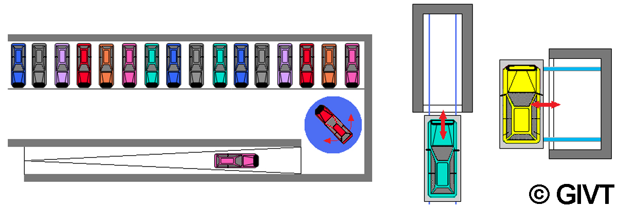 | Anwendungsbeispiele für mechanische Einparkhilfen: Drehplatte als Rangierhilfe in einer sehr eng bemessenen 180° Kurve in einer Tiefgarage (links), Verschiebepaletten als Einfahrhilfen für besonders enge Einzelgaragen (mitte und rechts) |