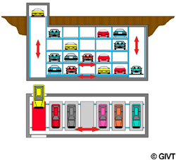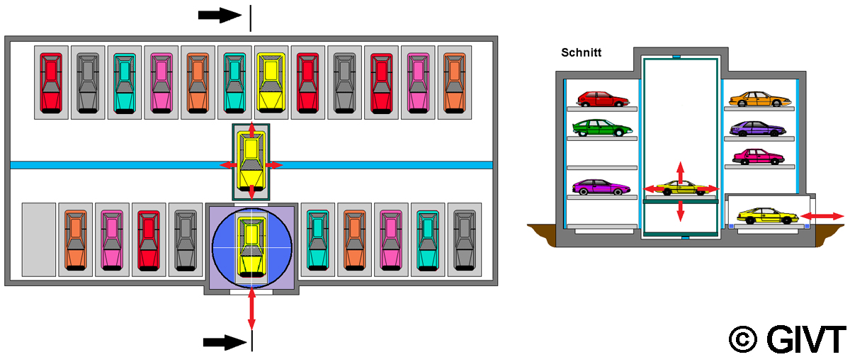 Parkbühnen mit Verschiebepaletten Bei Parkbühnen mit Verschiebepaletten sind die Parkpaletten in der Einfahrtebene jeweils horizontal, quer zur Einfahrtrichtung verschiebbar. Die Parkpaletten auf darüber oder darunter liegenden Stellplätzen sind jeweils vertikal in die Einfahrtebene holbar. Deshalb muss in der Einfahrtebene ein Leerplatz vorgesehen werden. Das Ein- und Ausparken erfolgt jeweils über das entsprechende vertikale Raster der Parkebene.