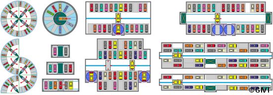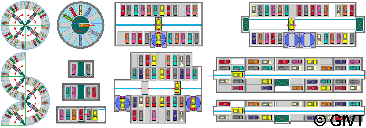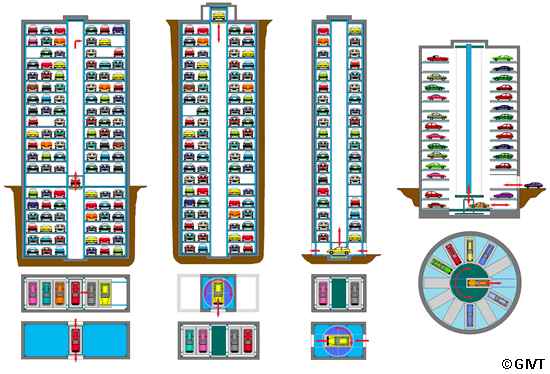| Verschiedene Parkregale in Turm-, Schacht- und gemischter Bauweise mit zentralem Fördergerät und Direktzugriff bzw. bis zu dreifach tiefer Einlagerung |