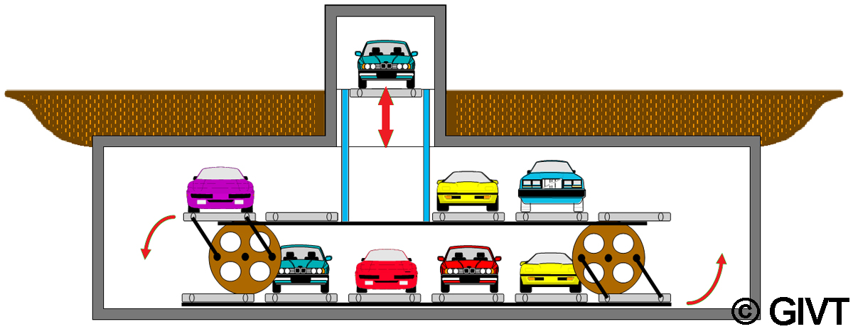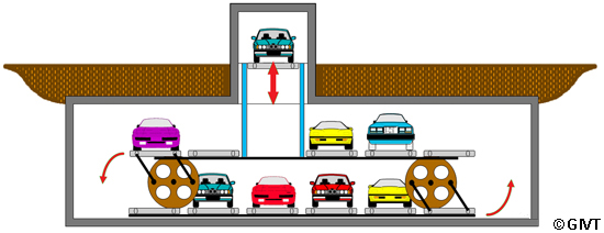 | Umlaufparker (Horizontalpaternoster), hier mit zusätzlichem Vertikalförderer und Übergabekabine, wurden oft mit direkt befahrbaren Parkplattformen ohne gesonderte Übergabekabine ausgestattet und sind dann nur als halbautomatische Parksysteme zu werten. |