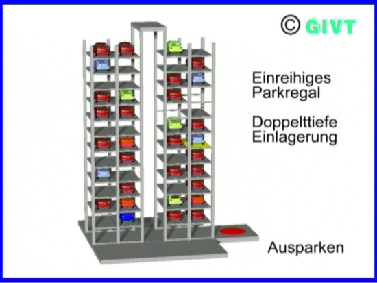 | Beim vertikalen Parkregal mit nur einer Regalreihe werden die abzustellenden Fahrzeuge nach dem Transport auf die entsprechende Parkebene in den Stellplatz unmittelbar neben dem Vertikalförderer eingelagert. Dieses System gestattet eine besonders Grundfläche sparende Systemgestaltung in unter- oder oberirdischer Bauart und ist gut modular einsetzbar. |